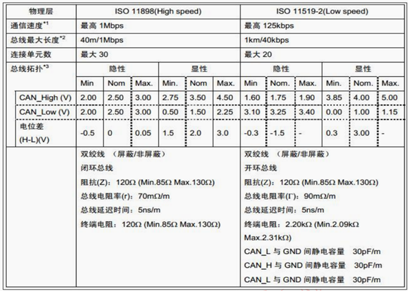 CAN 已通过 ISO11898 及 ISO11519 进行了标准化,这两种标准在物理层的主要不同点如图1所示: