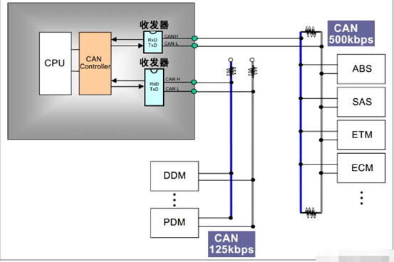 2. 开环结构的CAN总线网络,两根信号线独立,各自串联一个2.2k欧的电阻。这种CAN总线网络由ISO11519-2标准定义,是低速、远距离的CAN网络,通信速率最高125kbit/s。在40kbit/s速率时,总线最长距离可达1000m。