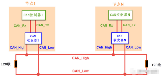 与 I2C、SPI 等具有时钟信号的同步通讯方式不同,CAN 通讯并不是以时钟信号来进行同步的,它是一种异步通讯,只具有 CAN_High 和 CAN_Low 两条信号线,共同构成一组差分信号线,以差分信号的形式进行通讯。CAN连接示意图如图2所示: