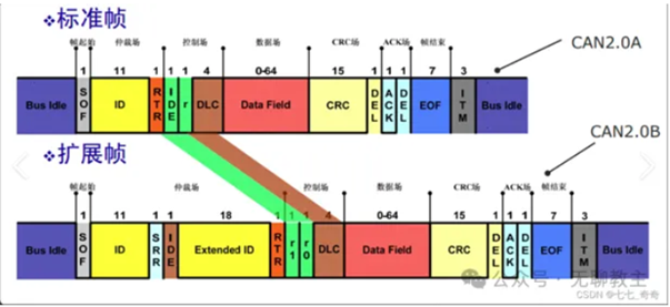 仲裁段:包含消息标识符(标准帧11位,扩展帧29位)和远程传输请求位(RTR),用于优先级仲裁。