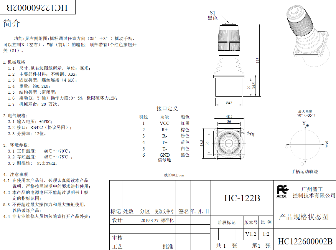 HC-122B,高可靠的双轴(X、Y)霍尔摇杆(配置两个优质防水按钮),串口全双工(RS-422)输出,采用先进MEMS技术,控制简单、操作方便,适用于精密仪器、医疗设备、安防监控等应用。